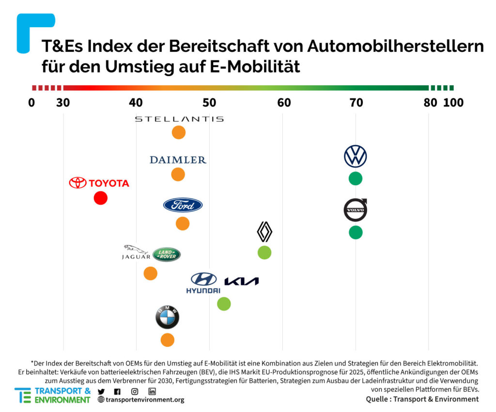 En las ultimas posiciones tenemos a Stellantis, Daimler, BMW, Jaguar Land Rover y Toyota, quienes según la fuente, cuentan con bajas ventas de baterías eléctricas a corto plazo (BEV), sin objetivos ambiciosos de eliminación gradual, sin una estrategia industrial clara. BMW. Daimler y Toyota de momento tiene una dependencia excesiva de los vehículos híbridos.