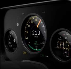 El “Multigraph”: Un panel de control montado sobre una rótula que puede orientarse hacia el conductor o el pasajero, gestionado por tres motores independientes para funciones de cronógrafo, brújula y launch control.