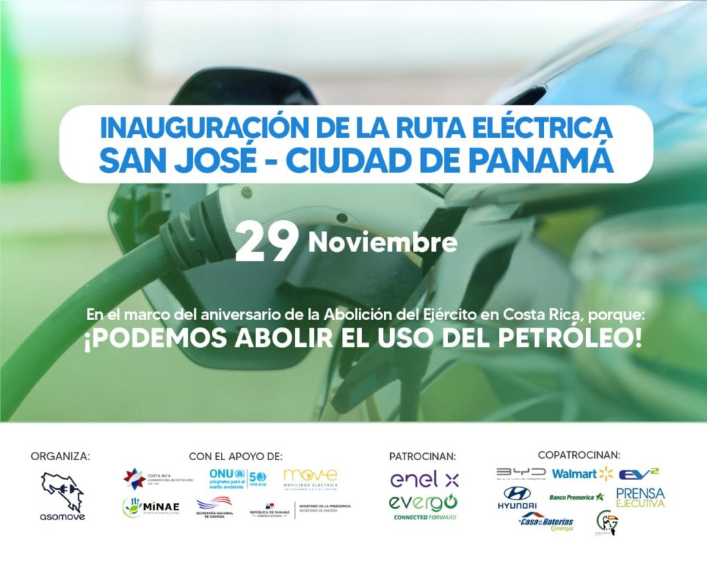 ASOMOVE, Asociación Costarricense de Movilidad Eléctrica, realizará la primera gira de vehículos 100% eléctricos desde San Jose Costa Rica, hasta Ciudad de Panamá.